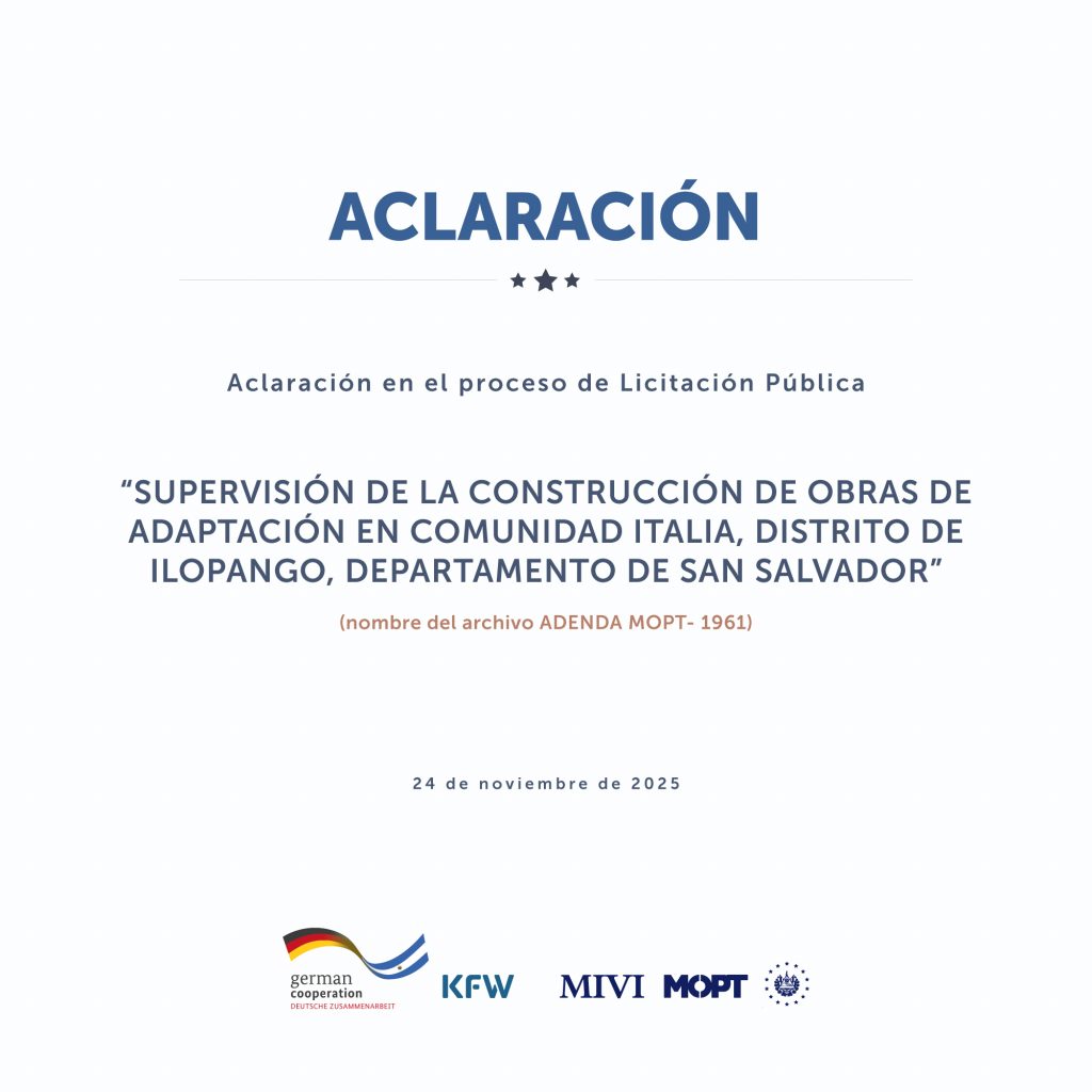 Aclaración en el proceso de Licitación Pública Supervisión de la Construcción de Obras de Adaptación en Comunidad Italia, Ilopango, San Salvador