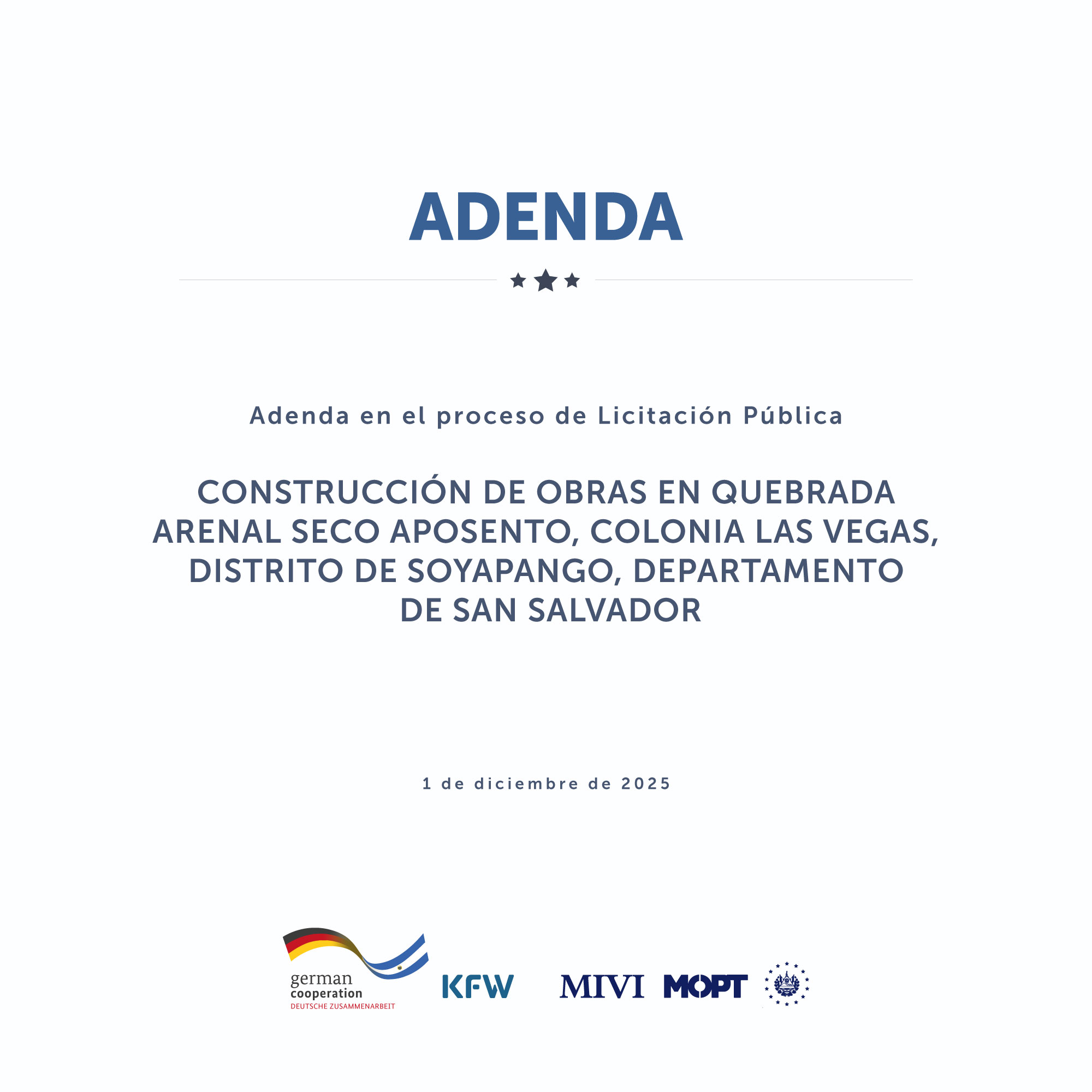 Adenda en el proceso de Licitación Pública construcción de obras en quebrada Arenal Seco Aposento, colonia Las Vegas, Soyapango, San Salvador. Última modificación: 01/12/2025 Leer
