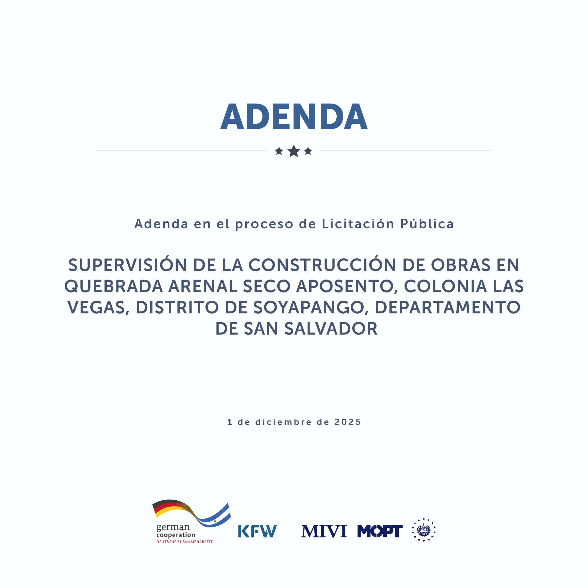 Adenda proceso de Licitación Pública supervisión de la construcción de obras en quebrada Arenal Seco Aposento, colonia Las Vegas, Soyapango, San Salvador. Última modificación: 01/12/2025 Leer